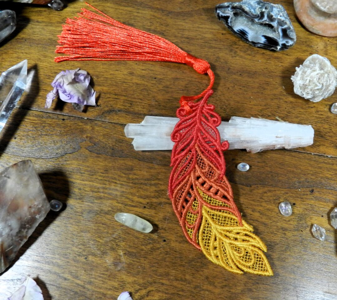 One of my favorite Feather designs, this little bookmark is stitched in autumn colors and adorned with a matching tassel. The feather is approx. 4″ long without the tassel.