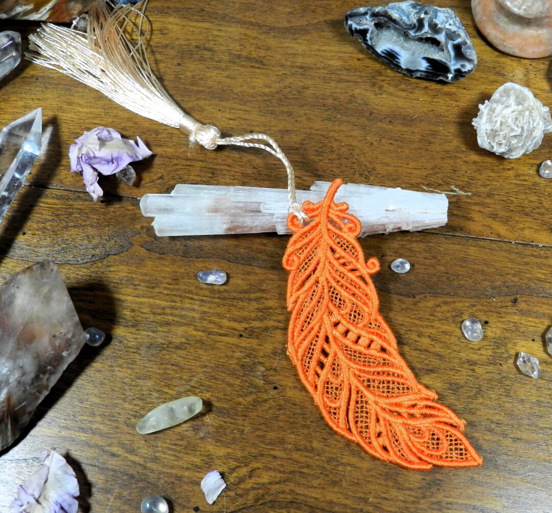 One of my favorite Feather designs, this little bookmark is stitched in orange and adorned with a matching tassel. The feather is approx. 4″ long without the tassel.