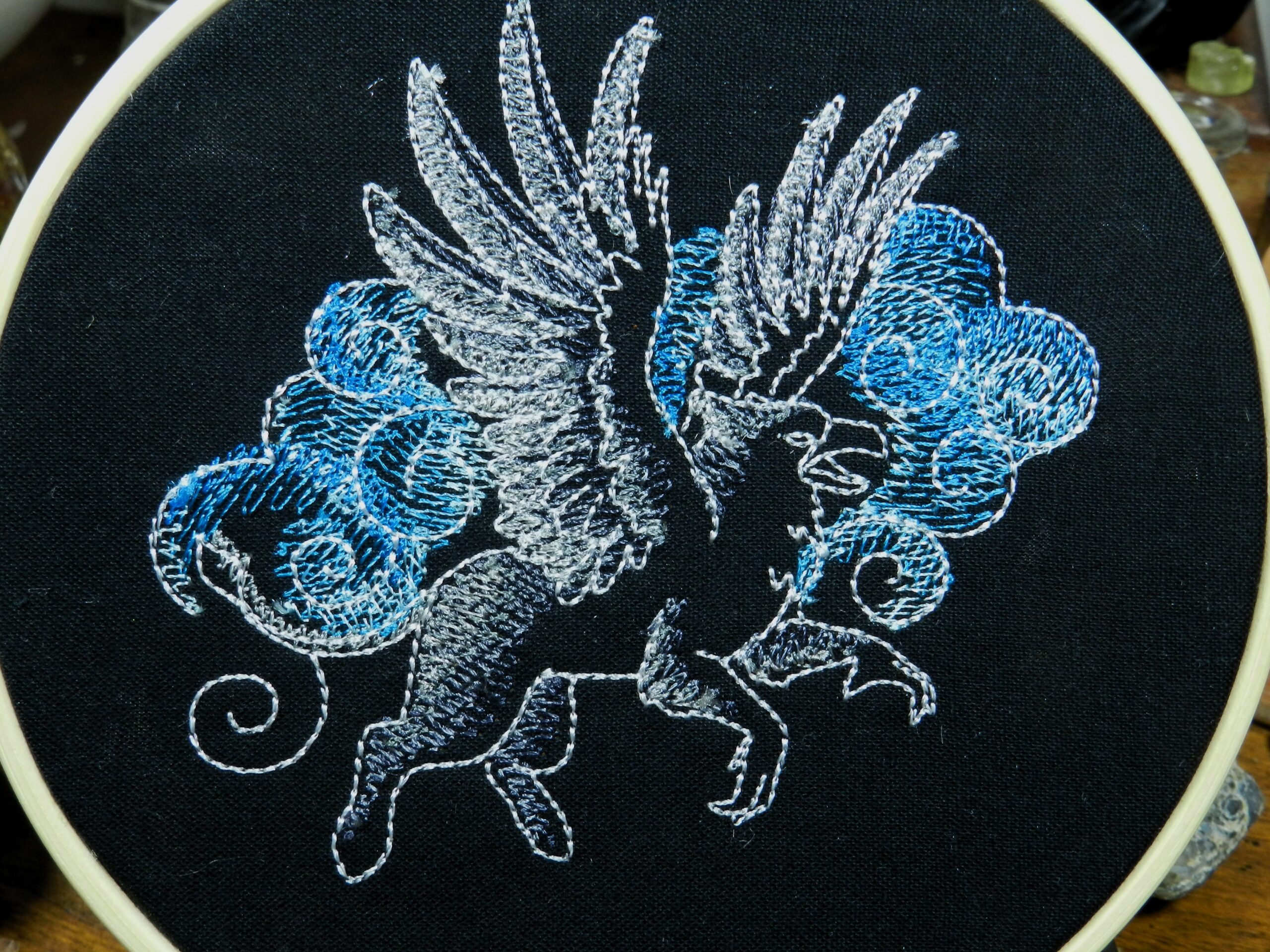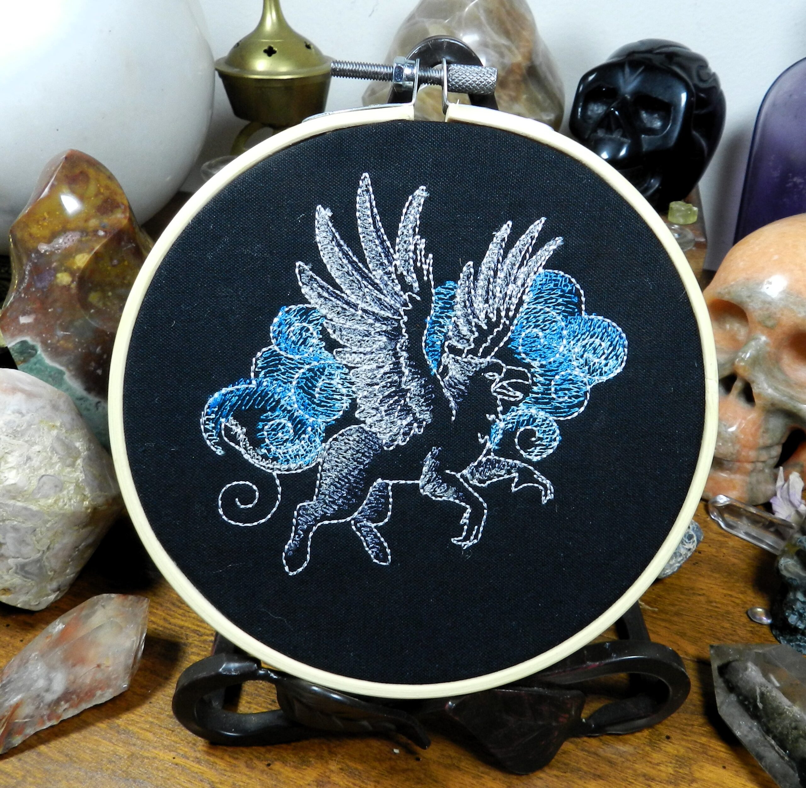 A simply beautiful little Griffin from the Midnight Magick Collection. I love the feel of flight and the swirl of blues. This is a 4” design, and he is framed in a 5” bamboo hoop.