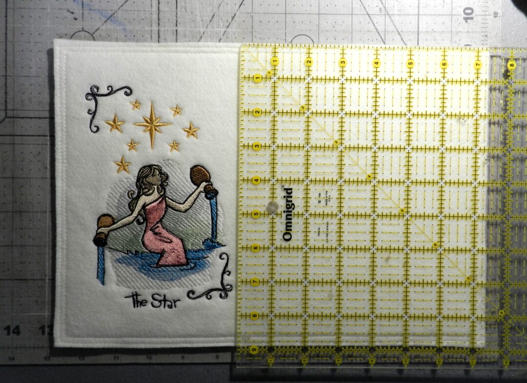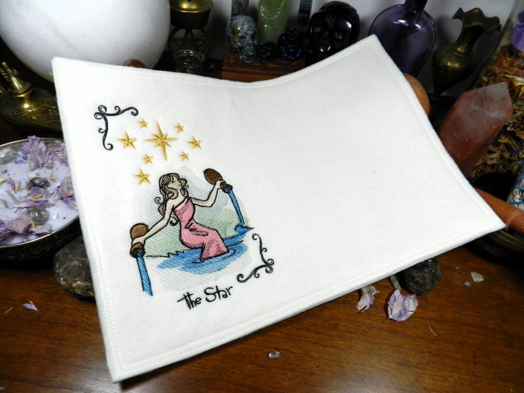 This lovely The Star Tarot Card embroidered felt mat is the perfect addition to your crystal displays or to sit a pretty planter on. The design is approx. 5×7″, and the mat is approx. 9×13″. I used two layers of felt for durability and a clean looking back. I left the edges of this raw so they didn’t look bulky and the mat would lay nicely.